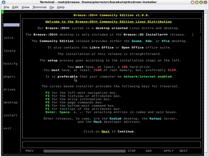A new installer framework was implemented, based on pages. Pages refer to the steps or tasks required to complete a particular installation. The new installer framework provides two interfaces; one graphical and one console-based, powered by X11 GTK2 and ncurses respectively. The new framework is versatile enough, to allow the development of a non-interactive or batch installation of our distribution; even though the interfaces themselves do not directly support it. Such support will be provided in subsequent releases of the installer.